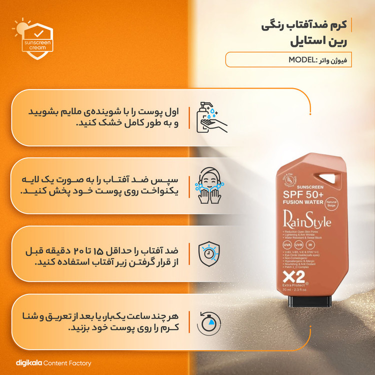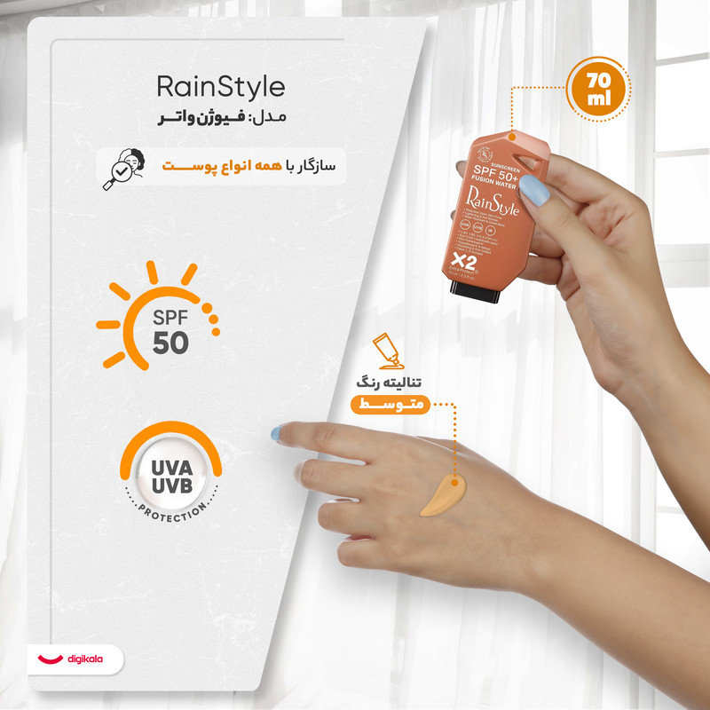 ضد آفتاب های فیوژن واتر طیف گستردهای از اشعههای مضر را پوشش میدهد و از پوست در برابر آسیبهای ناشی از نور خورشید محافظت میکند و با بافت سبک و آبرسان خود به سرعت جذب پوست میشود و احساس سنگینی ایجاد نمیکند. ضد آفتاب رنگی رین استایل مدل فیوژن واتر یک محصول چندکاره است که هم پوست شما را در برابر اشعههای مضر خورشید محافظت میکند و هم به آن رنگ و رو میدهد. این ضد آفتاب با فرمولاسیون سبک و آبرسان، برای انواع پوست مناسب بوده و محافظت قوی و جامعی را در برابر اشعههای UVA و UVB فراهم میکند.